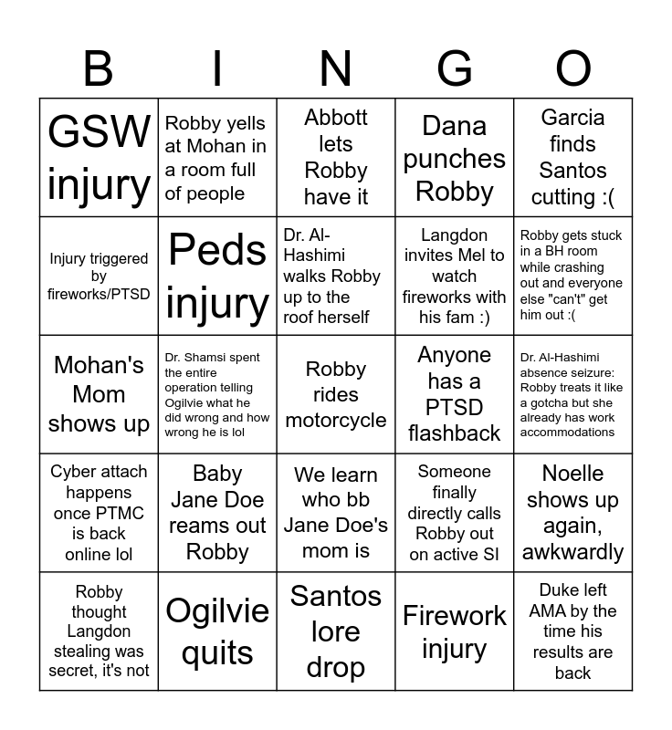 This bingo card has a free space and 24 words: Baby Jane Doe reams out Robby, Ogilvie quits, Dr. Al-Hashimi walks Robby up to the roof herself, Robby thought Langdon stealing was secret, it's not, Garcia finds Santos cutting :(, GSW injury, Injury triggered by fireworks/PTSD, Robby yells at Mohan in a room full of people, Anyone has a PTSD flashback, We learn who bb Jane Doe's mom is, Langdon invites Mel to watch fireworks with his fam :), Mohan's Mom shows up, Someone finally directly calls Robby out on active SI, Noelle shows up again, awkwardly, Peds injury, Firework injury, Dr. Al-Hashimi absence seizure: Robby treats it like a gotcha but she already has work accommodations, Abbott lets Robby have it, Robby gets stuck in a BH room while crashing out and everyone else "can't" get him out :(, Dr. Shamsi spent the entire operation telling Ogilvie what he did wrong and how wrong he is lol, Duke left AMA by the time his results are back, Cyber attach happens once PTMC is back online lol, Dana punches Robby and Santos lore drop.