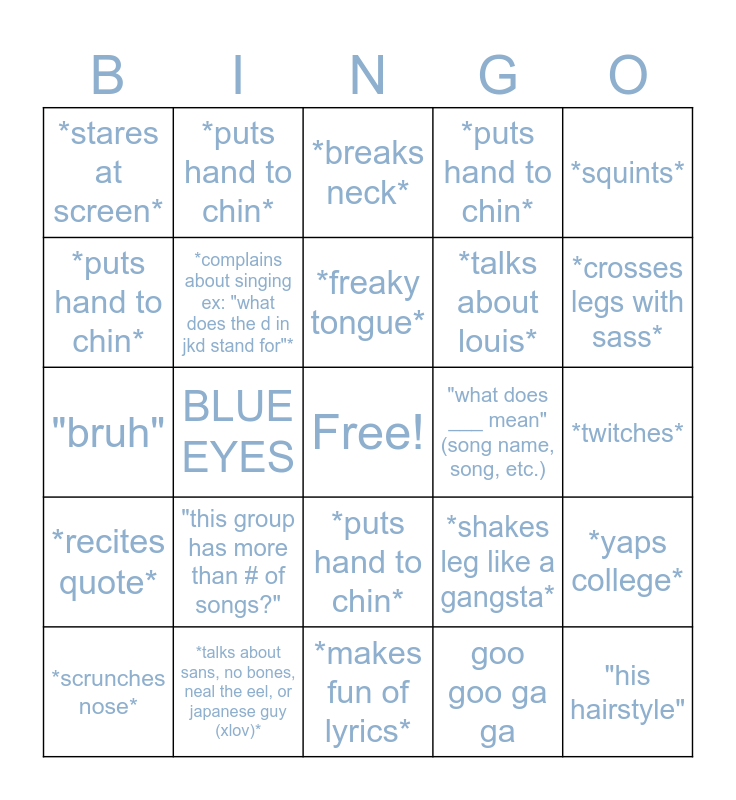 This bingo card has a free space and 29 words: *puts hand to chin*, *talks about sans, no bones, neal the eel, or japanese guy (xlov)*, *breaks neck*, *bone cracks*, *squints*, *stares at screen*, *complains about singing ex: "what does the d in jkd stand for"*, *freaky tongue*, "what does ___ mean" (song name, song, etc.), *yaps college*, *scrunches nose*, BLUE EYES, goo goo ga ga, "his hairstyle", "bruh", *says the letter that is being searched up*, *makes fun of lyrics*, *shakes leg like a gangsta*, *crosses legs with sass*, *recites quote*, "this group has more than # of songs?", *snores/complains about a song*, *talks about louis*, *twitches*, *puts hand to chin*, *puts hand to chin*, *puts hand to chin*, *puts hand to chin* and *puts hand to chin*.