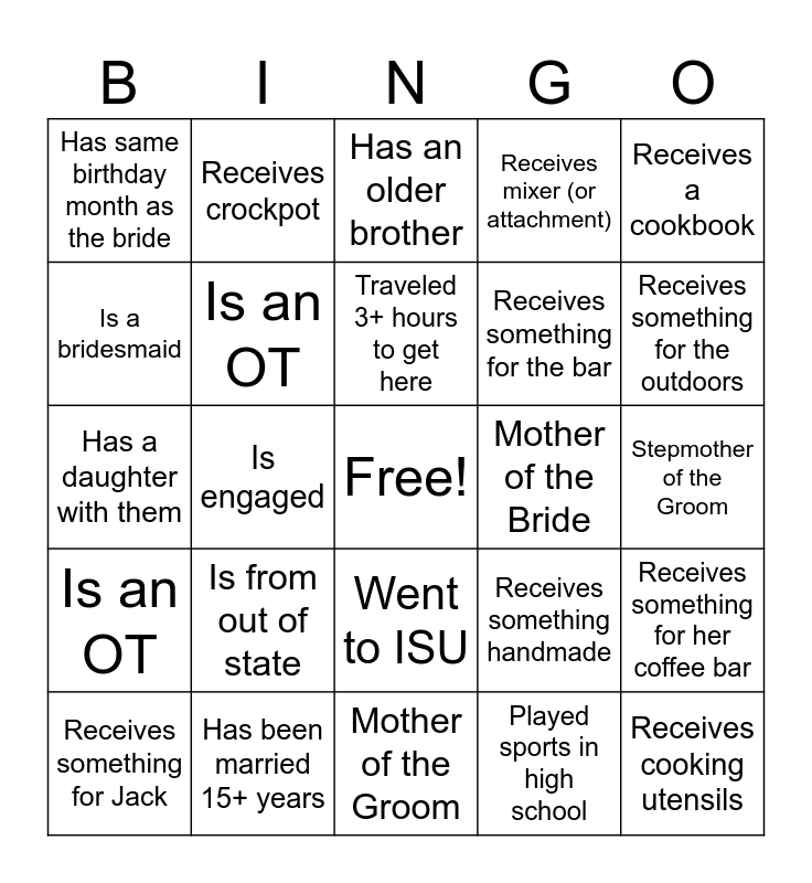 This bingo card has a free space and 30 words: Has been married 15+ years, Married last year, Is engaged, Is from out of state, Has same birthday month as the bride, Has an older brother, Is an OT, Went to ISU, Mother of the Bride, Mother of the Groom, Stepmother of the Groom, Receives cooking utensils, Played sports in high school, Receives towels or sheets, Receives something for the outdoors, Receives household goods, Receives something handmade, Is an OT, Is from out of state, Receives a cookbook, Has a daughter with them, Went to ISU, Receives crockpot, Receives something for the bar, Is a bridesmaid, Receives mixer (or attachment), Receives something for her coffee bar, Receives something for Jack, Traveled 3+ hours to get here and Has been married 20+ years.