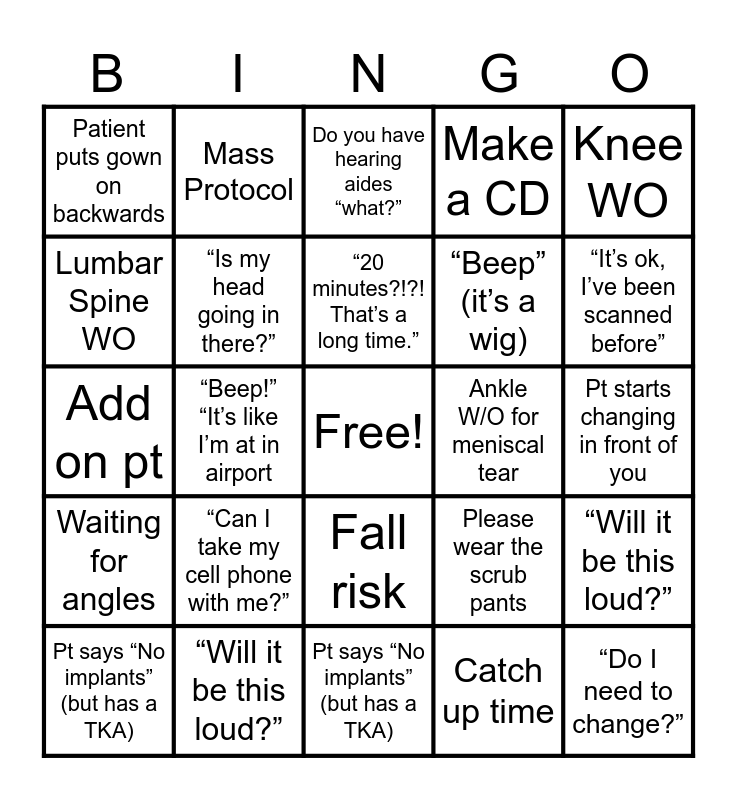 This bingo card has a free space and 47 words: Right Hip W/O, “Do I need to change?”, “It’s ok, I’ve been scanned before”, Pt says “No implants” (but has a TKA), “Can I take my cell phone with me?”, Cervical Spine W/WO, Mass Protocol, Arthrogram, Lumbar Spine WO, Claustrophobic Patient, “Is my head going in there?”, Make a CD, “Will it be this loud?”, Please wear the scrub pants, “I’m not moving”, Patient still wearing jewelry after changing, “20 minutes?!?! That’s a long time.”, Ankle W/O for meniscal tear, Do you have hearing aides “what?”, Knee WO, “Beep!” “It’s like I’m at in airport, Catch up time, Patient puts gown on backwards, “Beep” (it’s a wig), “Why do I need to change?”, “It’s ok, I’ve been scanned before”, Pt says “No implants” (but has a TKA), “Can I take my cell phone with me?”, Fall risk, Waiting for angles, Enterography, Pt arrives late, Claustrophobic Pt, “Is my head going in there?”, Make a CD, “Will it be this loud?”, Pt starts changing in front of you, “I’m not moving”, Patient still wearing jewelry after changing, “20 minutes?!?! That’s a long time.”, Ankle W/O for meniscal tear, Do you have hearing aides “what?”, Add on pt, “Beep!” “It’s like I’m at in airport”, Catch up time, Patient puts gown on backwards and “Are you almost done?” (2 mins in).