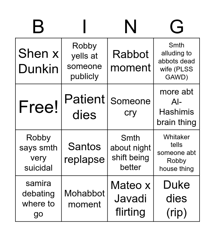 This bingo card has 16 words: Mohabbot moment, Whitaker tells someone abt Robby house thing, Rabbot moment, Shen x Dunkin, Robby says smth very suicidal, Robby yells at someone publicly, Smth about night shift being better, Mateo x Javadi flirting, Free!, Patient dies, samira debating where to go, Smth alluding to abbots dead wife (PLSS GAWD), Santos replapse, more abt Al-Hashimis brain thing, Someone cry and Duke dies (rip).