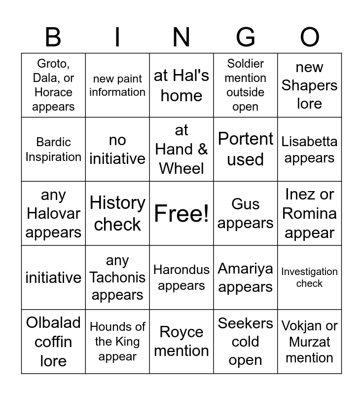 This bingo card has a free space and 34 words: Schemers cold open, Seekers cold open, Soldiers cold open, bird spotted, initiative, no initiative, new Shapers lore, Olbalad coffin lore, new paint information, at the Seven Stars, at Hand & Wheel, at Hal's home, Demodus found, Orus appears, Gus appears, Lisabetta appears, Hounds of the King appear, any Halovar appears, any Tachonis appears, Amariya appears, Harondus appears, Fazir appears, Groto, Dala, or Horace appears, Inez or Romina appear, Royce mention, Vokjan or Murzat mention, Soldier mention outside open, Seekers mention outside open, Portent used, Bardic Inspiration, Arcana check, History check, Investigation check and Stealth check.