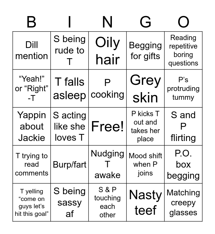 This bingo card has a free space and 24 words: Burp/fart, S being sassy af, P cooking, T yelling “come on guys let’s hit this goal”, Reading repetitive boring questions, Dill mention, “Yeah!” or “Right” -T, S being rude to T, P kicks T out and takes her place, Nudging T awake, Grey skin, Yappin about Jackie, Mood shift when P joins, P.O. box begging, T falls asleep, Nasty teef, S and P flirting, Oily hair, P’s protruding tummy, S acting like she loves T, Matching creepy glasses, T trying to read comments, Begging for gifts and S & P touching each other.