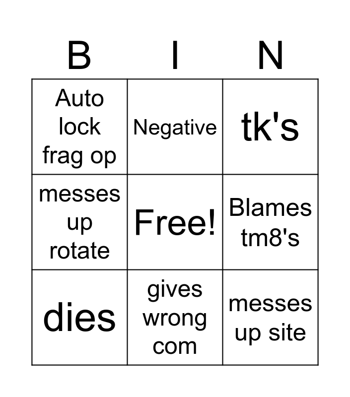 This bingo card has a free space and 8 words: Blames tm8's, tk's, Negative, dies, Auto lock frag op, messes up site, messes up rotate and gives wrong com.
