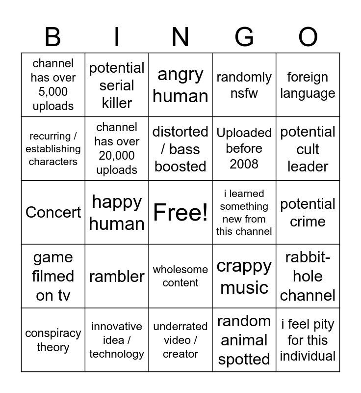 This bingo card has a free space and 24 words: rambler, innovative idea / technology, distorted / bass boosted, conspiracy theory, foreign language, channel has over 5,000 uploads, recurring / establishing characters, potential serial killer, i learned something new from this channel, wholesome content, Uploaded before 2008, Concert, crappy music, rabbit-hole channel, channel has over 20,000 uploads, random animal spotted, potential crime, angry human, potential cult leader, happy human, i feel pity for this individual, game filmed on tv, randomly nsfw and underrated video / creator.