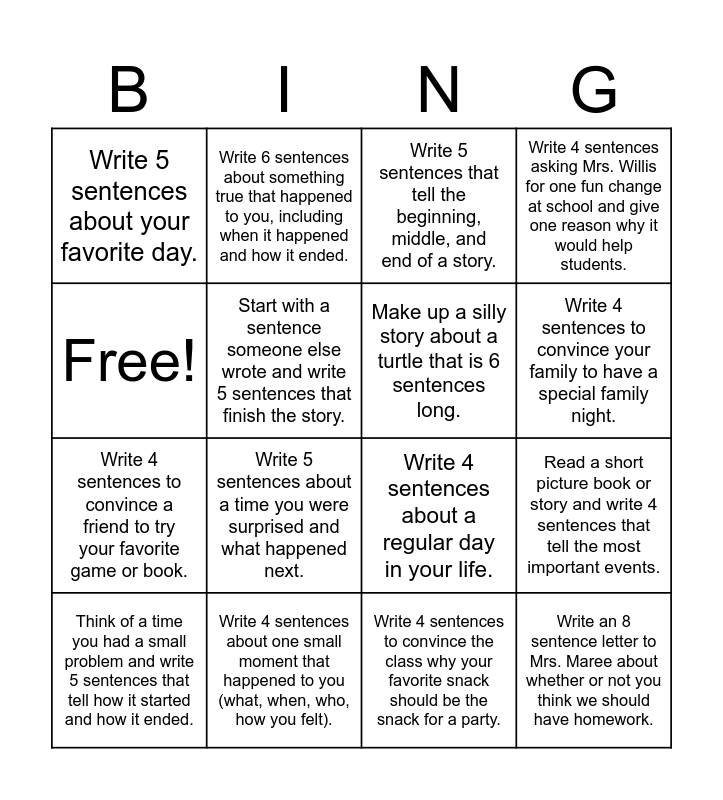 This bingo card has 16 words: Write 4 sentences about one small moment that happened to you (what, when, who, how you felt)., Read a short picture book or story and write 4 sentences that tell the most important events., Write 5 sentences that tell the beginning, middle, and end of a story., Write 5 sentences about your favorite day., Write 4 sentences to convince a friend to try your favorite game or book., Write 6 sentences about something true that happened to you, including when it happened and how it ended., Write 4 sentences about a regular day in your life., Write 4 sentences to convince the class why your favorite snack should be the snack for a party., Free!, Start with a sentence someone else wrote and write 5 sentences that finish the story., Think of a time you had a small problem and write 5 sentences that tell how it started and how it ended., Write 4 sentences asking Mrs. Willis for one fun change at school and give one reason why it would help students., Write 5 sentences about a time you were surprised and what happened next., Write 4 sentences to convince your family to have a special family night., Make up a silly story about a turtle that is 6 sentences long. and Write an 8 sentence letter to Mrs. Maree about whether or not you think we should have homework..