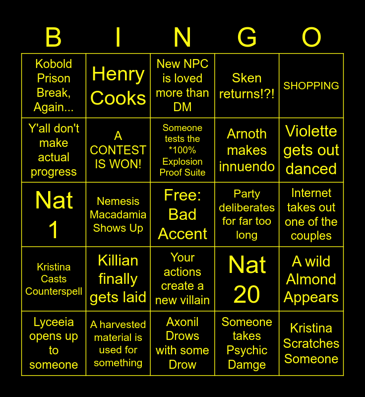 This bingo card has a free space and 24 words: Killian finally gets laid, A harvested material is used for something, Someone tests the *100% Explosion Proof Suite, Lyceeia opens up to someone, SHOPPING, Kobold Prison Break, Again..., Y'all don't make actual progress, Henry Cooks, Party deliberates for far too long, Your actions create a new villain, Arnoth makes innuendo, Nat 1, Nat 20, A wild Almond Appears, A CONTEST IS WON!, Someone takes Psychic Damge, Internet takes out one of the couples, New NPC is loved more than DM, Violette gets out danced, Nemesis Macadamia Shows Up, Kristina Scratches Someone, Kristina Casts Counterspell, Sken returns!?! and Axonil Drows with some Drow.
