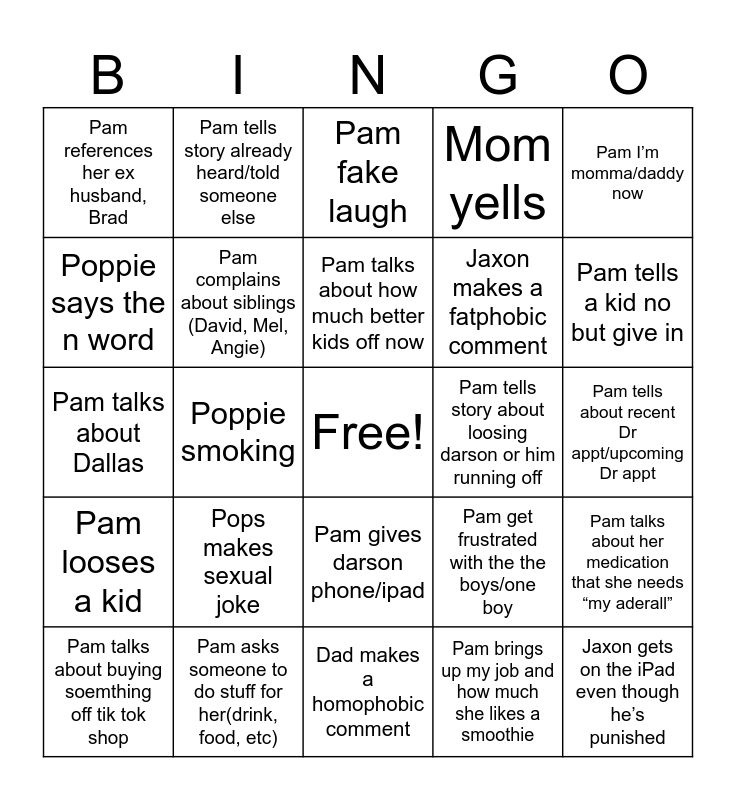 This bingo card has a free space and 33 words: Bronchial collapse, Poppie fake laugh, Poppie smoking, Pam talks about Jack, Pam looses a kid, Pam complains about siblings (David, Mel, Angie), Pam I’m momma/daddy now, Pam talks about buying soemthing off tik tok shop, Pam tells story already heard/told someone else, Pam references a tik tok, Pam talks about how much better kids off now, Pam fake laugh, Pam fussed at kid but doenst get up, Pam complains about Judy, Pam tells story about loosing darson or him running off, Pam tells a kid no but give in, Pam asks someone to do stuff for her(drink, food, etc), Pam talks about Dallas, Pops makes sexual joke, Pam get frustrated with the the boys/one boy, Pam gives darson phone/ipad, Pam talks about mouth sores, Pam references her ex husband, Brad, Pam tells about recent Dr appt/upcoming Dr appt, Dad makes a homophobic comment, Jaxon gets on the iPad even though he’s punished, Mom yells, Jaxon makes a fatphobic comment, Poppie says the n word, Pam talks about her medication that she needs “my aderall”, Pat shows up bouji asf, Pam brings up my job and how much she likes a smoothie and Nana leaves after being here for an hour max.