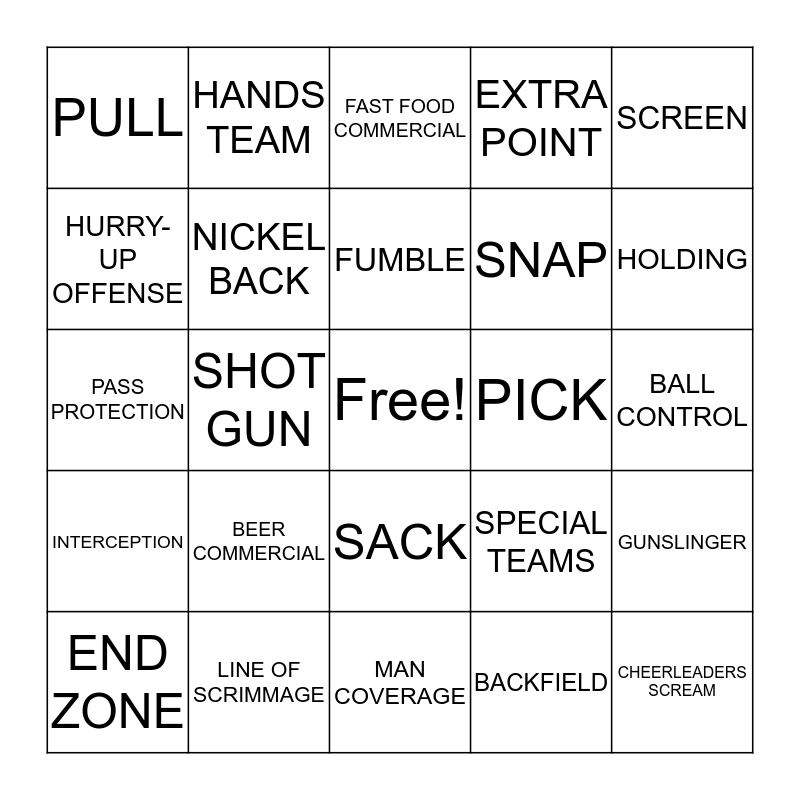 This bingo card has a free space and 65 words: DELAY OF GAME, HUDDLE, RUSH, GUNSLINGER, RUNNING OUT THE CLOCK, HOLE, HANDS TEAM, GOAL LINE, FUMBLE, QUARTER, SACK, DEAD BALL, BALL CONTROL, SCREEN, DROP KICK, HURRY-UP OFFENSE, SHOT GUN, PULL, ENCROACHMENT, SNAP, BEER COMMERCIAL, INTERCEPTION, EXTRA POINT, HAIL MARY!, HOLDING, FAIR CATCH, HASH MARKS, PLAY ACTION, CHEERLEADERS SCREAM, POST PATTERN, END ZONE, BLITZ, SCRAMBLE, RED SHIRT, SPECIAL TEAMS, LINE OF SCRIMMAGE, PERSONAL FOUL, PASS PROTECTION, BACKFIELD, QUARTERBACK SNEAK, NICKEL BACK, INTENTIONAL GROUNDING, PICK, ELIGIBLE RECEIVER, BLOCK, SAFETY, HOLDING, SACK, TOUCHDOWN, FAN WITH PAINTED FACE, BOOTLET, BROKEN PLAY, LIVE BALL, MAN COVERAGE, FLAG, KICK OFF, BOMB, FAST FOOD COMMERCIAL, RUNNING UP THE SCORE, PASS INTERFERENCE, DRAW PLAY, POCKET, CHAINS, HORSE COLLAR and CHALLENGE.