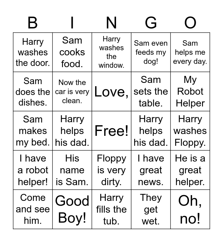 This bingo card has a free space and 30 words: Good Boy!, The car is very dirty., Harry helps his dad., Harry washes the car., Harry washes the door., Harry washes the window., Now the car is very clean., Floppy is very dirty., Harry helps his dad., Harry fills the tub., Harry washes Floppy., Oh, no!, They get wet., “What a bad dog!”, My Robot Helper, Dear Jenny,, I have great news., I have a robot helper!, His name is Sam., Sam helps me every day., Sam makes my bed., Sam cleans my room., Sam cooks food., Sam sets the table., Sam does the dishes., Sam even feeds my dog!, He is a great helper., Come and see him., Love, and Grandma.