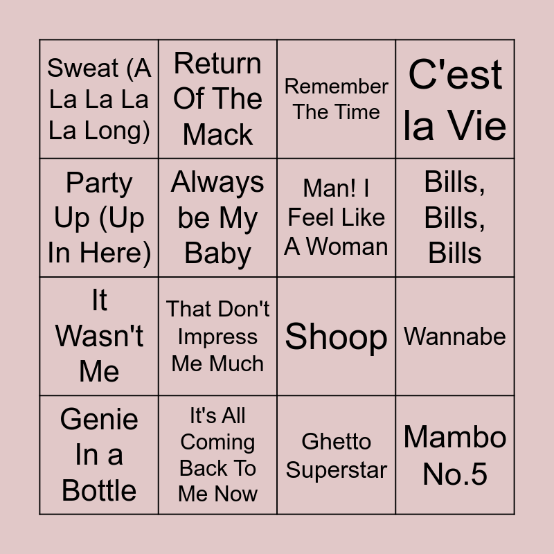 This bingo card has 32 words: Waterfalls, Santeria, Wannabe, This Is How We Do It, Mambo No.5, Man! I Feel Like A Woman, Party Up (Up In Here), Fantasy, Return Of The Mack, Say My Name, Bills, Bills, Bills, Remember The Time, No Scrubs, Pony, It's All Coming Back To Me Now, California Love, Gettin' Jiggy Wit It, Shoop, As Long As You Love Me, This Kiss, MMMBop, Baby, One More Time, Ghetto Superstar, Changes, Genie In a Bottle, C'est la Vie, It Wasn't Me, Always be My Baby, Sweat (A La La La La Long), Black or White, I Want It That Way and That Don't Impress Me Much.