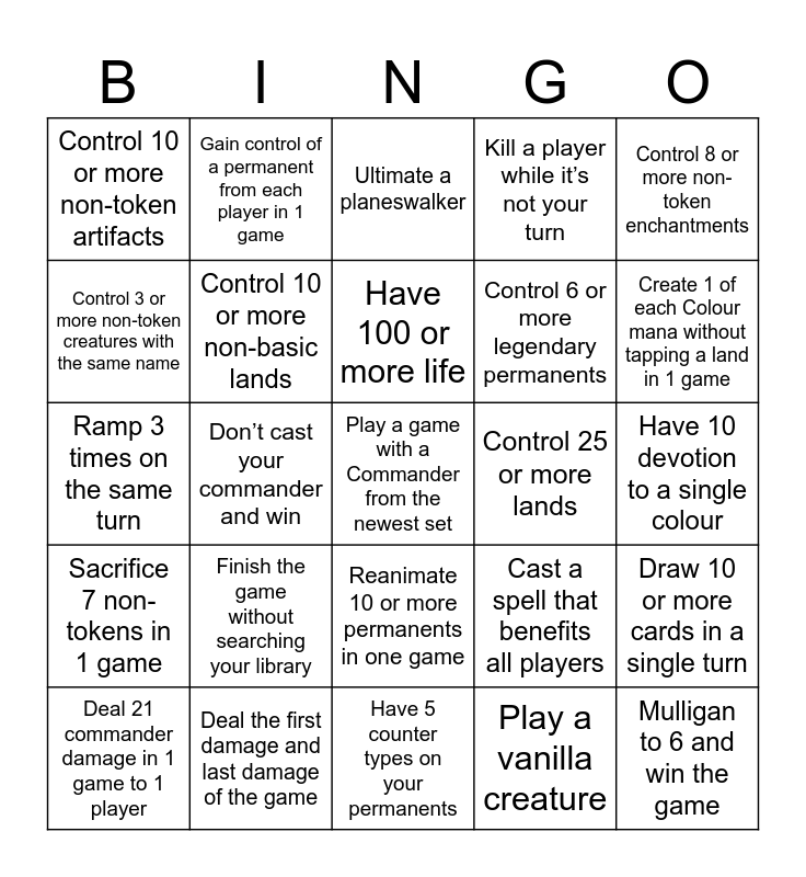 This bingo card has a free space and 24 words: Finish the game without searching your library, Deal the first damage and last damage of the game, Have 100 or more life, Deal 21 commander damage in 1 game to 1 player, Control 8 or more non-token enchantments, Control 10 or more non-token artifacts, Control 3 or more non-token creatures with the same name, Gain control of a permanent from each player in 1 game, Control 25 or more lands, Reanimate 10 or more permanents in one game, Control 6 or more legendary permanents, Ramp 3 times on the same turn, Cast a spell that benefits all players, Draw 10 or more cards in a single turn, Control 10 or more non-basic lands, Play a vanilla creature, Have 10 devotion to a single colour, Ultimate a planeswalker, Create 1 of each Colour mana without tapping a land in 1 game, Don’t cast your commander and win, Mulligan to 6 and win the game, Sacrifice 7 non-tokens in 1 game, Kill a player while it’s not your turn and Have 5 counter types on your permanents.