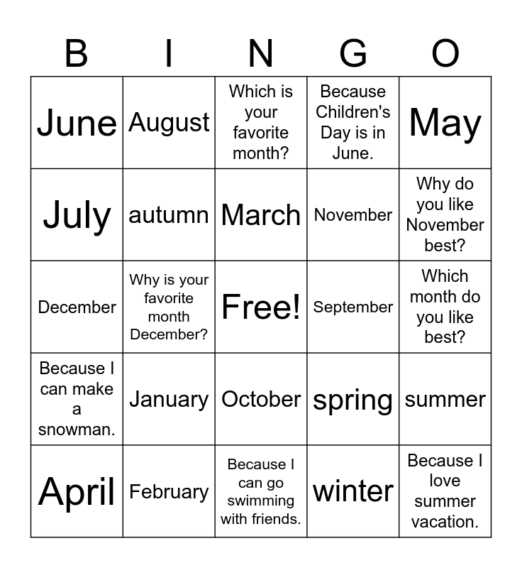 This bingo card has a free space and 24 words: January, February, March, April, May, June, July, August, September, October, November, December, spring, summer, autumn, winter, Which month do you like best?, Which is your favorite month?, Why do you like November best?, Why is your favorite month December?, Because I love summer vacation., Because I can make a snowman., Because Children's Day is in June. and Because I can go swimming with friends..