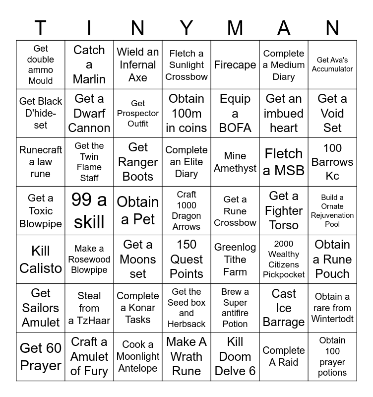 This bingo card has 49 words: Cast Ice Barrage, Get an imbued heart, Kill Doom Delve 6, 99 a skill, Get Ranger Boots, Build a Ornate Rejuvenation Pool, Catch a Marlin, Cook a Moonlight Antelope, Complete a Medium Diary, 150 Quest Points, Get Ava's Accumulator, Fletch a Sunlight Crossbow, Fletch a MSB, Mine Amethyst, Steal from a TzHaar, Get a Fighter Torso, Get Black D'hide-set, Get a Void Set, Obtain a rare from Wintertodt, Firecape, Equip a BOFA, Obtain a Pet, Get double ammo Mould, Get a Dwarf Cannon, Get 60 Prayer, Get Prospector Outfit, 100 Barrows Kc, Craft a Amulet of Fury, Complete an Elite Diary, Get the Twin Flame Staff, Obtain 100 prayer potions, Get a Rune Crossbow, Get Sailors Amulet, Complete a Konar Tasks, Get a Toxic Blowpipe, Greenlog Tithe Farm, 2000 Wealthy Citizens Pickpocket, Obtain a Rune Pouch, Runecraft a law rune, Get a Moons set, Get the Seed box and Herbsack, Kill Calisto, Craft 1000 Dragon Arrows, Make A Wrath Rune, Obtain 100m in coins, Wield an Infernal Axe, Brew a Super antifire Potion, Make a Rosewood Blowpipe and Complete A Raid.
