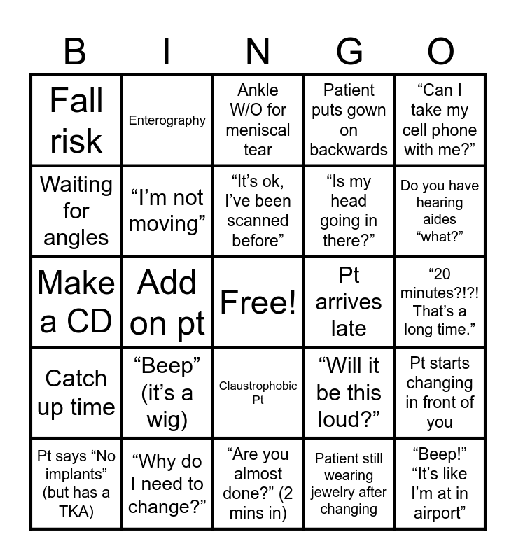 This bingo card has a free space and 24 words: “Beep” (it’s a wig), “Why do I need to change?”, “It’s ok, I’ve been scanned before”, Pt says “No implants” (but has a TKA), “Can I take my cell phone with me?”, Fall risk, Waiting for angles, Enterography, Pt arrives late, Claustrophobic Pt, “Is my head going in there?”, Make a CD, “Will it be this loud?”, Pt starts changing in front of you, “I’m not moving”, Patient still wearing jewelry after changing, “20 minutes?!?! That’s a long time.”, Ankle W/O for meniscal tear, Do you have hearing aides “what?”, Add on pt, “Beep!” “It’s like I’m at in airport”, Catch up time, Patient puts gown on backwards and “Are you almost done?” (2 mins in).