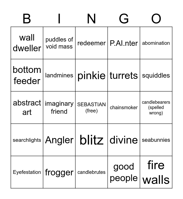 This bingo card has a free space and 24 words: Angler, frogger, pinkie, Eyefestation, abomination, wall dweller, bottom feeder, puddles of void mass, chainsmoker, blitz, turrets, abstract art, divine, seabunnies, landmines, good people, candlebearers (spelled wrong), redeemer, squiddles, imaginary friend, fire walls, searchlights, P.AI.nter and candlebrutes.