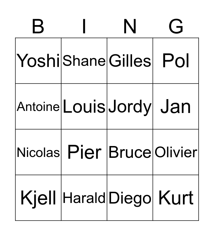 This bingo card has 16 words: Harald, Olivier, Gilles, Yoshi, Nicolas, Shane, Bruce, Diego, Antoine, Louis, Kjell, Pol, Pier, Jan, Jordy and Kurt.