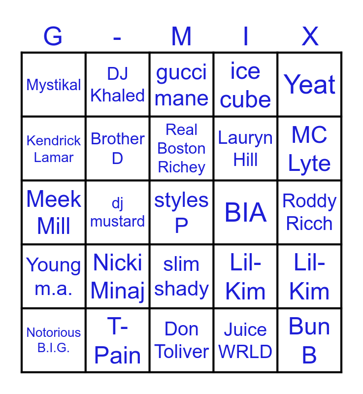 This bingo card has 160 words: Lil Tecca, LL Cool J, Young Jeezy, Lil Wayne, Soulja Boy, Ice-T, Coi Leray, Ice Spice, Finesse 2tymes, Tee Grizzley, Kendrick Lamar, SNOOP DOGG, gucci mane, Timbaland, Lil-Kim, Kurtis Blow, Dmx, Hurricane Chris, Slick Rick, Glorilla, Lil Baby, Da Baby, Drake, Kodak Black, King Von, Sage the Gemini, Mystikal, cam'ron, Salt-N-Pepa, Unk, Queen Latifah, Uncle Luke, 2 Chainz, Hanumankind, Young M.A., J. Cole, Offset, GloRilla, Jack Harlow, Jim Jones, MC Lyte, Waka flocka, megan thee stallion, missy elliott, Nas, 50 Cent, A$AP Rocky, Lupe Fiasco, Big Sean, Travis Scott, Tyga, Busta Rhymes, Playboi Carti, Juice WRLD, Juicy J, Bun B, fetty wap, French Montana, Bobby Shmurda, Dr. Dre, Roddy Ricch, ice cube, fabolous, nate dogg, Future, Lauryn Hill, Post Malone, Lola Brooke, JT, BIA, Erica Banks, Rubi Rose, Monaleo, Young m.a., scarlip, Lil Scrappy, slim shady, PLUTO, Gucci Mane, jay-z, Young Dolph, Yeat, OhGeesy, BashfortheWorld, Rockout Danny, BAK Jay, Ludacris, BossMan Dlow, Flo Milli, Doechii, BigXthaPlug, ScHoolboy Q, Lana Del Rey, Central Cee, NLE Choppa, Boosie, Big Boogie, Kevin Gates, Moneybagg yo, NBA Youngboy, tuPac, Notorious B.I.G., Meek Mill, Nicki Minaj, sexyy red, Latto, Connie Diiamond, KASH DOLL, Remy Ma, Cardi B, Asian Doll, Cash Cobain, Don Toliver, Rick Ross, Real Boston Richey, Brother D, Juvenile, Lil Jon, Trick Daddy, Flo Rida, Trina, Megan Thee Stallion, Scarface, Young Thug, Ace Hood, Yo Gotti, babychiefdolt, Gelo, odeal, kai ca$h, Plies, YFN Lucci, Rich Homie Quan, T-Pain, Travis Porter, 21 Savage, Shawty-Lo, Lil-Kim, TI, Master P, kanye west, dj mustard, Above the Law, Project Pat, yella Beezy, styles P, Fivo Foreign, DJ Khaled, Pop Smoke, 50 cent, Chief Keef, Tyler the Creator, Young M.A, bunnab, YKNiece, eve, Doja Cat, Rapsody, mia x and Taffy.