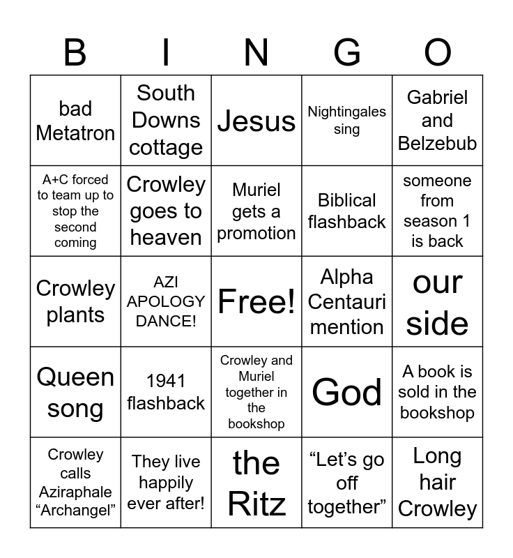 This bingo card has a free space and 24 words: 1941 flashback, They live happily ever after!, Muriel gets a promotion, Crowley calls Aziraphale “Archangel”, Gabriel and Belzebub, bad Metatron, A+C forced to team up to stop the second coming, South Downs cottage, Alpha Centauri mention, Crowley and Muriel together in the bookshop, Biblical flashback, Crowley plants, God, A book is sold in the bookshop, Crowley goes to heaven, “Let’s go off together”, our side, Jesus, someone from season 1 is back, AZI APOLOGY DANCE!, Long hair Crowley, Queen song, Nightingales sing and the Ritz.