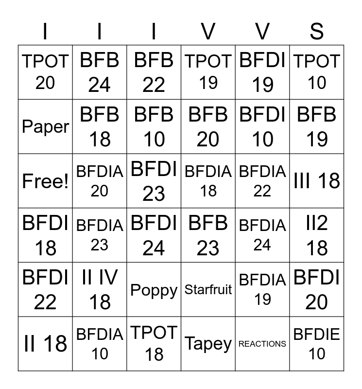 This bingo card has 36 words: Starfruit, Poppy, Tapey, Paper, BFDI 18, BFDIA 18, BFB 18, TPOT 18, BFDI 19, BFDIA 19, BFB 19, TPOT 19, BFDI 20, BFDIA 20, BFB 20, TPOT 20, BFDI 22, BFDIA 22, Free!, BFB 22, BFDI 23, BFDIA 23, BFB 23, BFDI 24, BFDIA 24, BFB 24, BFDI 10, BFDIA 10, BFB 10, TPOT 10, BFDIE 10, II 18, II2 18, III 18, II IV 18 and REACTIONS.
