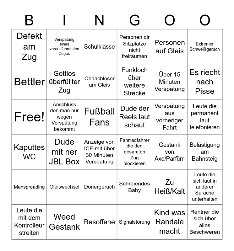 This bingo card has 36 words: Schreiendes Baby, Dönergeruch, Signalstörung, Bettler, Kaputtes WC, Dude der Reels laut schaut, Gottlos überfüllter Zug, Besoffene, Personen auf Gleis, Zu Heiß/Kalt, Es riecht nach Pisse, Personen dir Sitzplätze nicht freiräumen, Leute die sich laut in anderer Sprache unterhalten, Anschluss den man nur wegen Verspätung bekommt, Funkloch über weitere Strecke, Defekt am Zug, Manspreading, Verspätung aus vorheriger Fahrt, Free!, Schulklasse, Fußball Fans, Dude mit ner JBL Box, Fahrradfahrer die den gesamten Zug blockieren, Anzeige von ICE mit über 30 Minuten Verspätung, Gestank von Axe/Parfüm, Verspätung eines vorausfahrenden Zuges, Über 15 Minuten Verspätung, Weed Gestank, Obdachloser am Gleis, Extremer Schweißgeruch, Rentner die sich über alles Beschweren, Leute die mit dem Kontrolleur streiten, Belästigung am Bahnsteig, Leute die permanent laut telefonieren, Gleiswechsel and Kind was Randale macht.