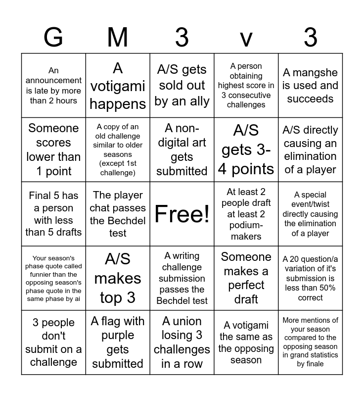 This bingo card has a free space and 24 words: A/S makes top 3, A flag with purple gets submitted, A non-digital art gets submitted, 3 people don't submit on a challenge, A mangshe is used and succeeds, An announcement is late by more than 2 hours, Someone scores lower than 1 point, A votigami happens, At least 2 people draft at least 2 podium-makers, A writing challenge submission passes the Bechdel test, A/S gets 3-4 points, Final 5 has a person with less than 5 drafts, Someone makes a perfect draft, A 20 question/a variation of it's submission is less than 50% correct, A copy of an old challenge similar to older seasons (except 1st challenge), A votigami the same as the opposing season, A special event/twist directly causing the elimination of a player, A/S gets sold out by an ally, A/S directly causing an elimination of a player, The player chat passes the Bechdel test, More mentions of your season compared to the opposing season in grand statistics by finale, Your season's phase quote called funnier than the opposing season's phase quote in the same phase by ai, A person obtaining highest score in 3 consecutive challenges and A union losing 3 challenges in a row.