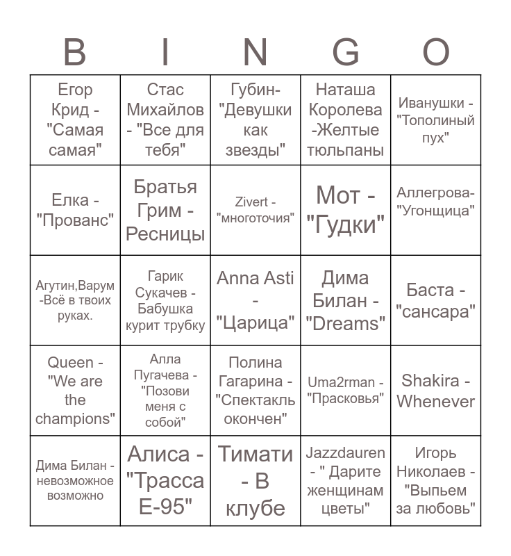 This bingo card has 25 words: Алла Пугачева -"Позови меня с собой", Тимати - В клубе, Zivert - "многоточия", Дима Билан - невозможное возможно, Иванушки - "Тополиный пух", Егор Крид - "Самая самая", Елка - "Прованс", Стас Михайлов - "Все для тебя", Дима Билан - "Dreams", Полина Гагарина - "Спектакль окончен", Мот - "Гудки", Агутин,Варум -Всё в твоих руках., Uma2rman - "Прасковья", Shakira - Whenever, Братья Грим - Ресницы, Игорь Николаев - "Выпьем за любовь", Баста - "сансара", Губин-"Девушки как звезды", Аллегрова- "Угонщица", Гарик Сукачев - Бабушка курит трубку, Anna Asti - "Царица", Алиса -"Трасса Е-95", Queen - "We are the champions", Наташа Королева -Желтые тюльпаны and Jazzdauren - " Дарите женщинам цветы".