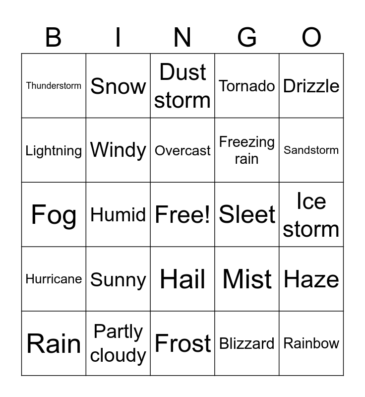 This bingo card has a free space and 24 words: Sunny, Partly cloudy, Overcast, Rain, Drizzle, Thunderstorm, Lightning, Snow, Sleet, Hail, Freezing rain, Fog, Mist, Haze, Windy, Blizzard, Ice storm, Dust storm, Sandstorm, Humid, Rainbow, Hurricane, Tornado and Frost.