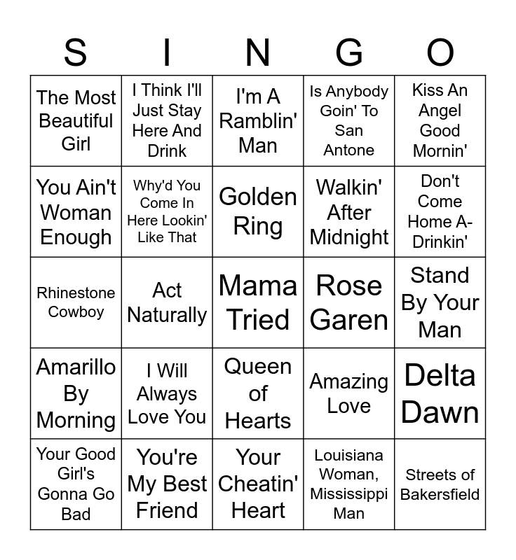 This bingo card has 35 words: The Happiest Girl In The Whole U.S.A., Hungry Eyes, The Gambler, Why'd You Come In Here Lookin' Like That, Queen of Hearts, Is Anybody Goin' To San Antone, You Ain't Woman Enough, She Thinks I Still Care, Golden Ring, Hello Darlin', Rhinestone Cowboy, Kiss An Angel Good Mornin', Coat Of Many Colors, Help Me Make It Through The Night, The Most Beautiful Girl, Rose Garen, Louisiana Woman, Mississippi Man, Act Naturally, Amarillo By Morning, Mama Tried, Amazing Love, Your Good Girl's Gonna Go Bad, Delta Dawn, You're My Best Friend, I'm A Ramblin' Man, Don't Come Home A-Drinkin', Streets of Bakersfield, Hello Walls, Walkin' After Midnight, Stand By Your Man, He Stopped Loving Her Today, Your Cheatin' Heart, I Will Always Love You, I Think I'll Just Stay Here And Drink and Mama Tried.