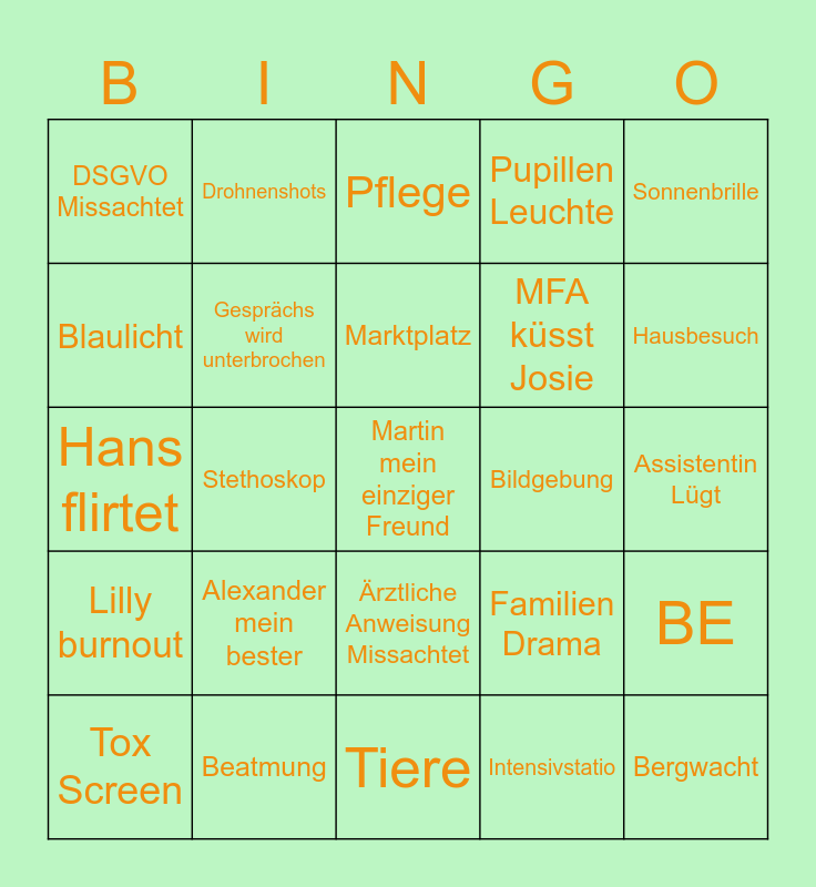 This bingo card has a free space and 24 words: Alexander mein bester, Beatmung, Marktplatz, Tox Screen, Sonnenbrille, DSGVO Missachtet, Blaulicht, Drohnenshots, Bildgebung, Ärztliche Anweisung Missachtet, MFA küsst Josie, Hans flirtet, Familien Drama, BE, Gesprächs wird unterbrochen, Intensivstatio, Assistentin Lügt, Pflege, Hausbesuch, Stethoskop, Bergwacht, Lilly burnout, Pupillen Leuchte and Tiere.