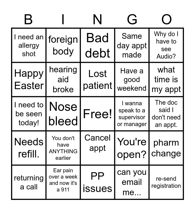 This bingo card has a free space and 29 words: returning a call, What is my co-pay/how much will it cost, Nose bleed, Referral scheduling, I need an allergy shot, Bad debt, hearing aid broke, You don't have ANYTHING earlier, I wanna speak to a supervisor or manager, Ear pain over a week and now it's a 911, The doc said I don't need an appt., re-send registration, PP issues, can you email me..., what time is my appt, reschedule, Cancel appt, Needs refill., Why do I have to see Audio?, I need to be seen today!, You're open?, God Bless, Have a good weekend, Happy Easter, Same day appt made, foreign body, pharm change, Lost patient and Wrong office.