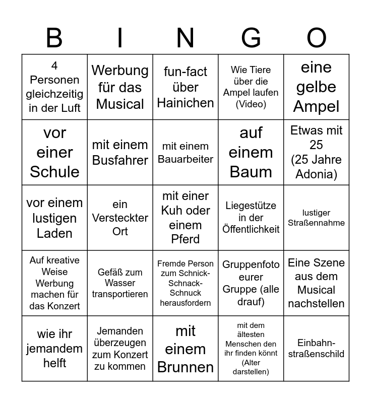 This bingo card has 25 words: Gefäß zum Wasser transportieren, mit einem Brunnen, mit einem Bauarbeiter, wie ihr jemandem helft, eine gelbe Ampel, 4 Personen gleichzeitig in der Luft, vor einer Schule, Werbung für das Musical, Liegestütze in der Öffentlichkeit, Fremde Person zum Schnick-Schnack-Schnuck herausfordern, auf einem Baum, vor einem lustigen Laden, Gruppenfoto eurer Gruppe (alle drauf), Eine Szene aus dem Musical nachstellen, mit einem Busfahrer, Einbahn-straßenschild, lustiger Straßennahme, fun-fact über Hainichen, Etwas mit 25 (25 Jahre Adonia), ein Versteckter Ort, mit einer Kuh oder einem Pferd, Jemanden überzeugen zum Konzert zu kommen, Auf kreative Weise Werbung machen für das Konzert, Wie Tiere über die Ampel laufen (Video) and mit dem ältesten Menschen den ihr finden könnt (Alter darstellen).