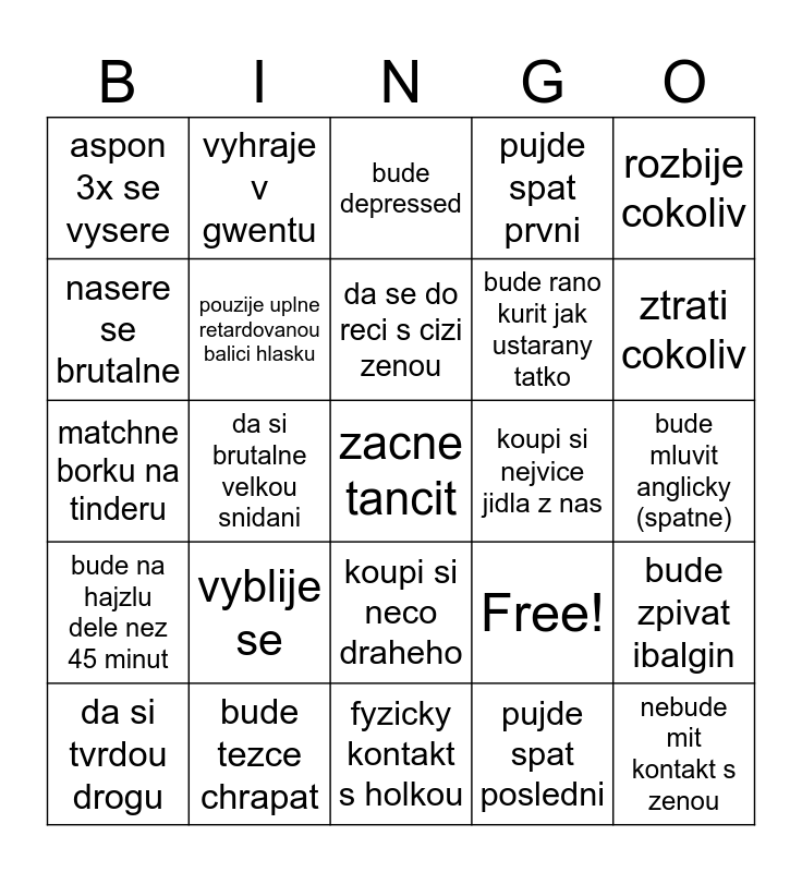 This bingo card has 25 words: vyblije se, fyzicky kontakt s holkou, da se do reci s cizi zenou, da si tvrdou drogu, rozbije cokoliv, aspon 3x se vysere, nasere se brutalne, vyhraje v gwentu, koupi si nejvice jidla z nas, koupi si neco draheho, bude rano kurit jak ustarany tatko, matchne borku na tinderu, Free!, bude zpivat ibalgin, pouzije uplne retardovanou balici hlasku, nebude mit kontakt s zenou, bude mluvit anglicky (spatne), bude depressed, ztrati cokoliv, da si brutalne velkou snidani, zacne tancit, bude tezce chrapat, bude na hajzlu dele nez 45 minut, pujde spat prvni and pujde spat posledni.