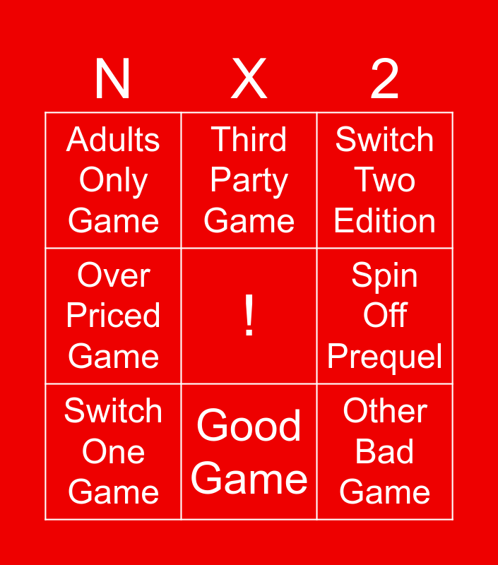 This bingo card has a free space and 9 words: Switch One Game, Switch Two Edition, Third Party Game, Over Priced Game, Adults Only Game, Spin Off Prequel, Other Bad Game, Other Console Port and Good Game.