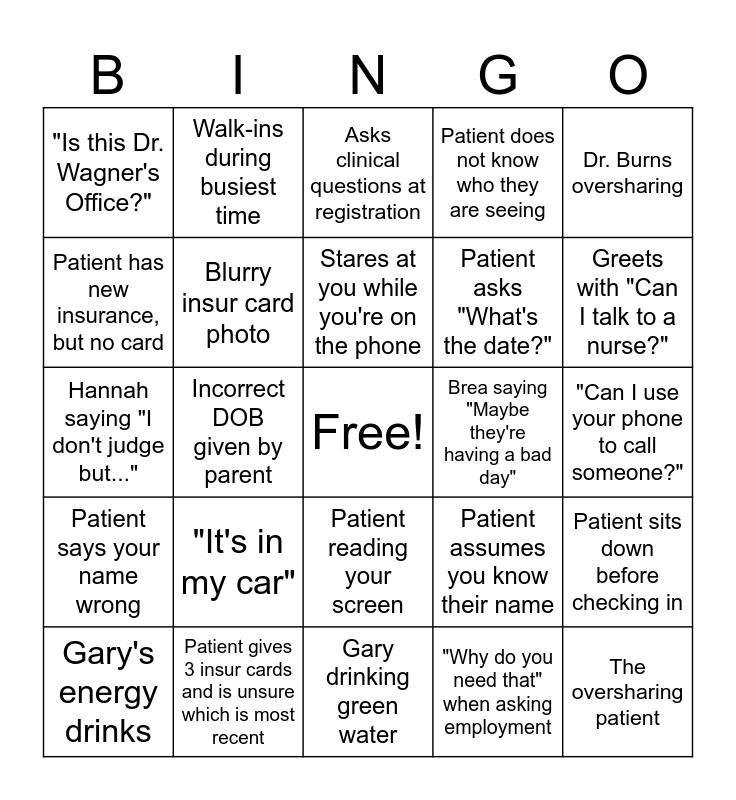 This bingo card has a free space and 24 words: "It's in my car", Patient gives 3 insur cards and is unsure which is most recent, Stares at you while you're on the phone, Gary's energy drinks, Dr. Burns oversharing, "Is this Dr. Wagner's Office?", Patient has new insurance, but no card, Walk-ins during busiest time, Brea saying "Maybe they're having a bad day", Patient reading your screen, Patient asks "What's the date?", Hannah saying "I don't judge but...", Patient assumes you know their name, Patient sits down before checking in, Blurry insur card photo, "Why do you need that" when asking employment, "Can I use your phone to call someone?", Asks clinical questions at registration, Greets with "Can I talk to a nurse?", Incorrect DOB given by parent, The oversharing patient, Patient says your name wrong, Patient does not know who they are seeing and Gary drinking green water.
