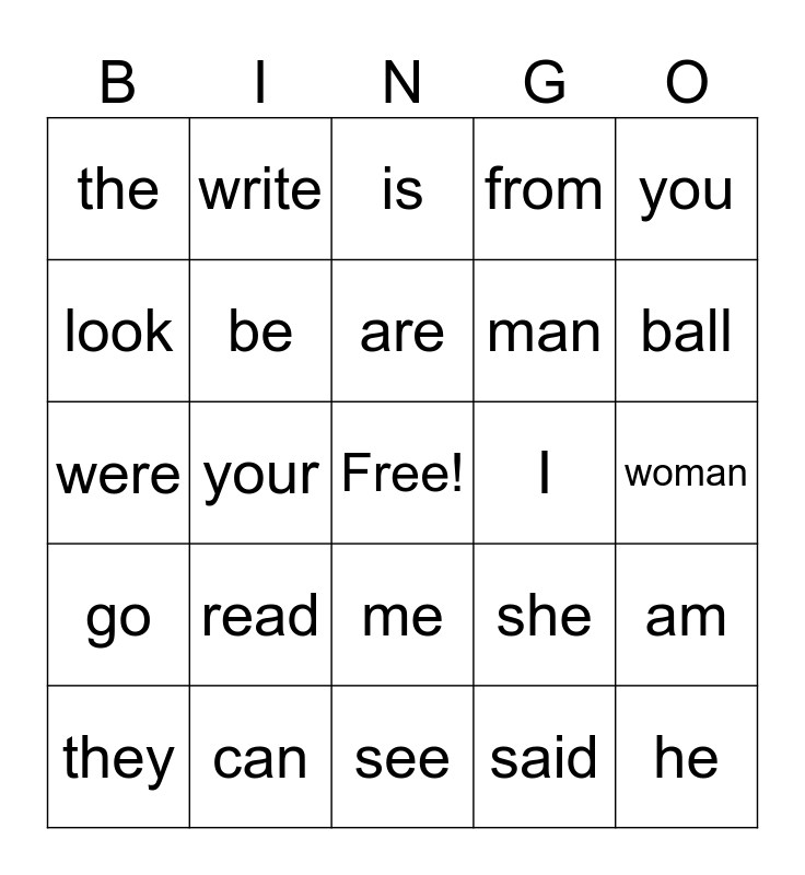This bingo card has a free space and 35 words: to, do, of, be, me, from, look, book, are, was, were, you, what, have, the, I, said, your, go, he, she, they, am, can, is, ball, cat, dog, man, woman, there, see, read, write and learn.