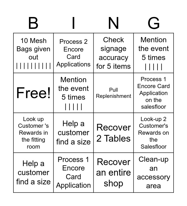 This bingo card has 16 words: Process 1 Encore Card Application, Look-up 2 Customer's Rewards on the Salesfloor, Check signage accuracy for 5 items, 10 Mesh Bags given out | | | | | | | | | |, Look up Customer 's Rewards in the fitting room, Process 2 Encore Card Applications, Recover 2 Tables, Recover an entire shop, Free!, Mention the event 5 times | | | | |, Help a customer find a size, Mention the event 5 times | | | | |, Help a customer find a size, Process 1 Encore Card Application on the salesfloor, Pull Replenishment and Clean-up an accessory area.