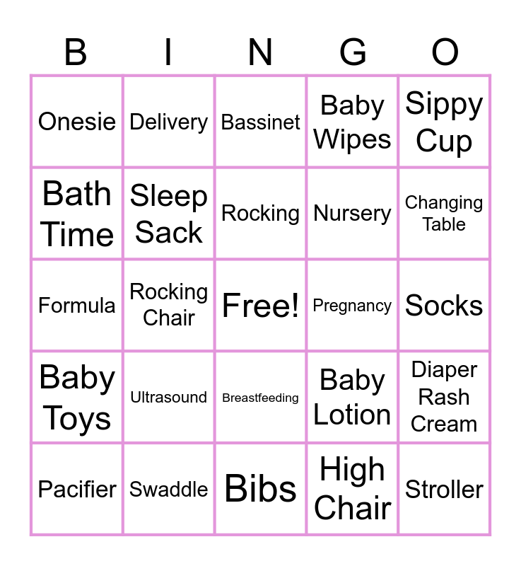 This bingo card has a free space and 24 words: Ultrasound, Swaddle, Rocking, Pacifier, Sippy Cup, Onesie, Bath Time, Delivery, Pregnancy, Breastfeeding, Nursery, Formula, Baby Lotion, Diaper Rash Cream, Sleep Sack, High Chair, Socks, Bassinet, Changing Table, Rocking Chair, Stroller, Baby Toys, Baby Wipes and Bibs.