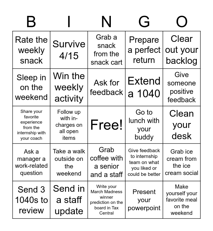 This bingo card has a free space and 24 words: Take a walk outside on the weekend, Send in a staff update, Ask for feedback, Send 3 1040s to review, Clear out your backlog, Rate the weekly snack, Sleep in on the weekend, Survive 4/15, Go to lunch with your buddy, Grab coffee with a senior and a staff, Extend a 1040, Share your favorite experience from the internship with your coach, Give feedback to internship team on what you liked or could be better, Grab ice cream from the ice cream social, Win the weekly activity, Present your powerpoint, Clean your desk, Grab a snack from the snack cart, Give someone positive feedback, Follow up with in-charges on all open items, Make yourself your favorite meal on the weekend, Ask a manager a work-related question, Prepare a perfect return and Write your March Madness winner prediction on the board in Tax Central.