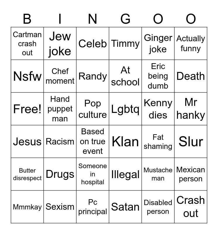 This bingo card has 36 words: Illegal, Someone in hospital, Satan, Nsfw, Jesus, Lgbtq, Chef moment, Pc principal, Ginger joke, Mustache man, Death, Timmy, Mexican person, Hand puppet man, At school, Cartman crash out, Butter disrespect, Kenny dies, Free!, Celeb, Pop culture, Racism, Klan, Based on true event, Fat shaming, Jew joke, Eric being dumb, Sexism, Randy, Actually funny, Crash out, Mmmkay, Slur, Mr hanky, Drugs and Disabled person.