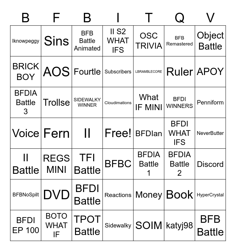 This bingo card has a free space and 48 words: Money, Ruler, Sidewalky, Fern, SIDEWALKY WINNER, NeverButter, Sins, BOTO WHAT IF, BFB Remastered, BFBC, Object Battle, II S2 WHAT IFS, BFDI WINNERS, What IF MINI, BFBNoSpilt, BFDI WHAT IFS, BRICK BOY, APOY, Book, OSC TRIVIA, LBRAMBLECORE, II, Iknowpeggy, AOS, HyperCrystal, Fourtle, Penniform, BFDI EP 100, Cloudimations, Trollse, katyj98, BFDIan, Discord, DVD, Voice, BFDIA Battle 1, BFDIA Battle 2, BFDIA Battle 3, TFI Battle, BFDI Battle, II Battle, BFB Battle, BFB Battle Animated, TPOT Battle, Subscribers, Reactions, REGS MINI and SOIM.