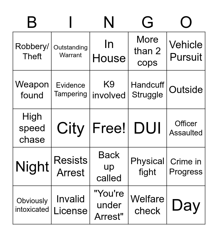 This bingo card has a free space and 24 words: Resists Arrest, Invalid License, K9 involved, Obviously intoxicated, Vehicle Pursuit, Robbery/ Theft, Weapon found, Outstanding Warrant, DUI, Back up called, Handcuff Struggle, High speed chase, Physical fight, Crime in Progress, Evidence Tampering, Welfare check, Officer Assaulted, In House, Outside, City, Day, Night, More than 2 cops and "You're under Arrest".
