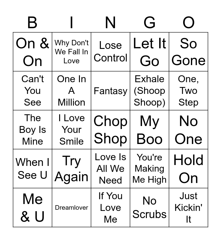 This bingo card has a free space and 35 words: Rock The Boat, Be Happy, So Into You, One In A Million, Love Is All We Need, Let It Go, Can't You See, Weak, Fantasy, Can We, The Boy Is Mine, So Gone, Foolish, Rock Wit U, On & On, My Boo, No Scrubs, I Love Your Smile, When I See U, Just Kickin' It, You're Making Me High, Me & U, Hold On, Dreamlover, Lose Control, One, Two Step, Don't Go, Where My Girls At?, Exhale (Shoop Shoop), No One, I Wanna Be Down, If You Love Me, Try Again, Why Don't We Fall In Love and Crazy In Love.