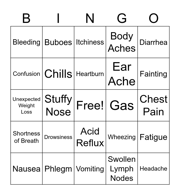 This bingo card has a free space and 37 words: Dry Cough, Productive Cough, Fever, Chills, Fatigue, Drowsiness, Heartburn, Indigestion, Diarrhea, Runny Nose, Stuffy Nose, Body Aches, Headache, Chest Pain, Confusion, Shortness of Breath, Hives, Itchiness, Acid Reflux, Gas, Bleeding, Fainting, Nausea, Vomiting, Hallucinations, Swollen Lymph Nodes, Buboes, Rash, Blisters, Warts, Redness, Phlegm, Unexpected Weight Loss, Heart Palpitations, Wheezing, Ear Ache and Constipation.