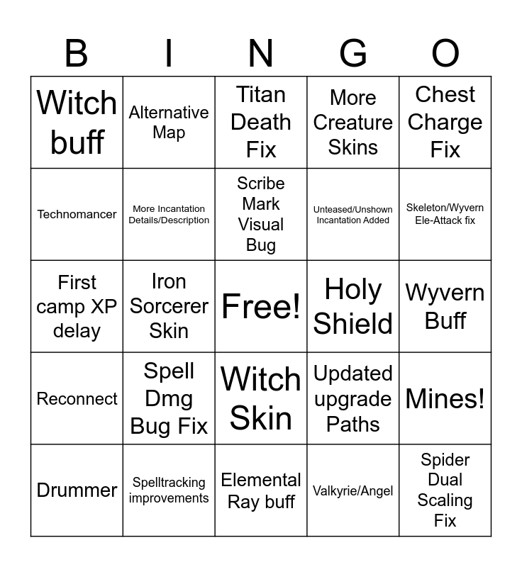 This bingo card has a free space and 24 words: Spell Dmg Bug Fix, Spelltracking improvements, Scribe Mark Visual Bug, Drummer, Chest Charge Fix, Witch buff, Technomancer, Alternative Map, Holy Shield, Witch Skin, Unteased/Unshown Incantation Added, First camp XP delay, Updated upgrade Paths, Mines!, More Incantation Details/Description, Valkyrie/Angel, Wyvern Buff, Titan Death Fix, Skeleton/Wyvern Ele-Attack fix, Iron Sorcerer Skin, Spider Dual Scaling Fix, Reconnect, More Creature Skins and Elemental Ray buff.