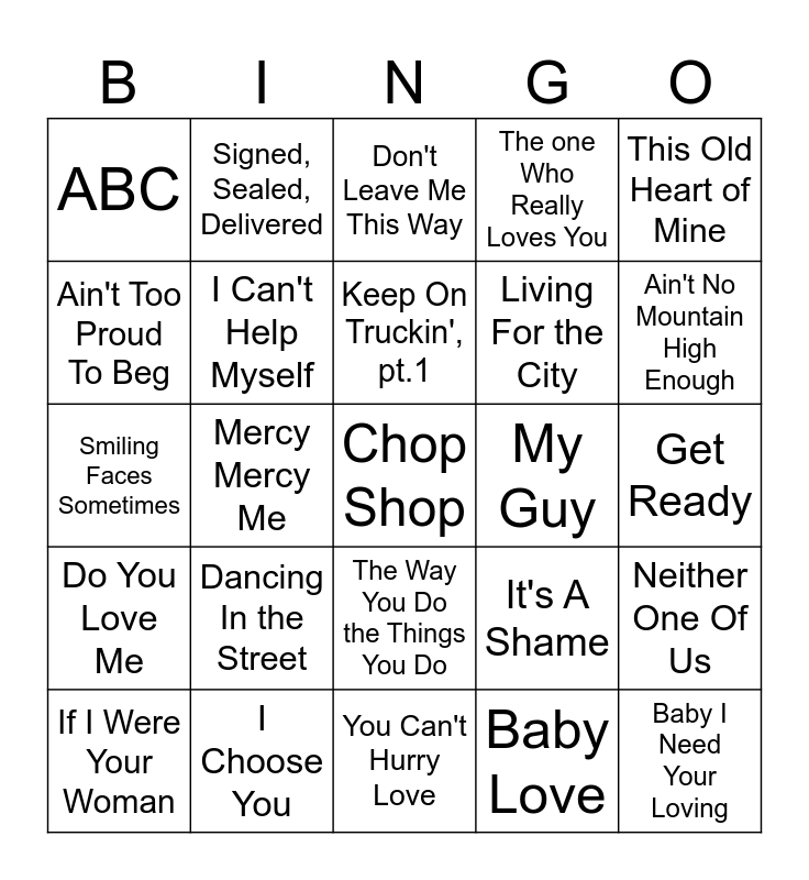 This bingo card has a free space and 34 words: My Girl, Baby Love, The Tracks of My Tears, I Heard It Through the Grapevine, Do You Love Me, I Can't Help Myself, This Old Heart of Mine, If I Were Your Woman, Signed, Sealed, Delivered, I Want You Back, Keep On Truckin', pt.1, Don't Leave Me This Way, Shotgun, Please Mr. Postman, My Guy, Ain't No Mountain High Enough, I Choose You, Smiling Faces Sometimes, Dancing In the Street, It's A Shame, The Way You Do the Things You Do, How Sweet It Is, ABC, Get Ready, You Can't Hurry Love, Baby I Need Your Loving, The one Who Really Loves You, Baby I'm For Real, Living For the City, Ain't Too Proud To Beg, Superstition, Mercy Mercy Me, Neither One Of Us and Reach Out I'll Be There.