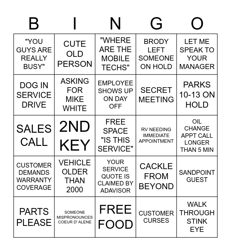 This bingo card has a free space and 29 words: PARTS PLEASE, DEAD BATTERY IN KEY FOB, 2ND KEY, ARRIVING LATE, "YOU GUYS ARE REALLY BUSY", "WHERE ARE THE MOBILE TECHS", ASKING FOR MIKE WHITE, VEHICLE OLDER THAN 2000, RV NEEDING IMMEDIATE APPOINTMENT, SOMEONE MISPRONOUNCES COEUR D' ALENE, OIL CHANGE APPT CALL LONGER THAN 5 MIN, WALK THROUGH STINK EYE, FREE FOOD, CUSTOMER CURSES, PARKS 10-13 ON HOLD, NEW RECALL LAUNCHES, YOUR SERVICE QUOTE IS CLAIMED BY ADAVISOR, CUSTOMER DEMANDS WARRANTY COVERAGE, LET ME SPEAK TO YOUR MANAGER, SALES CALL, CACKLE FROM BEYOND, GHOST RECALL, SECRET MEETING, DOG IN SERVICE DRIVE, BRODY LEFT SOMEONE ON HOLD, CUTE OLD PERSON, SANDPOINT GUEST, EMPLOYEE SHOWS UP ON DAY OFF and FORMER EMPLOYE WALK THROUGH.