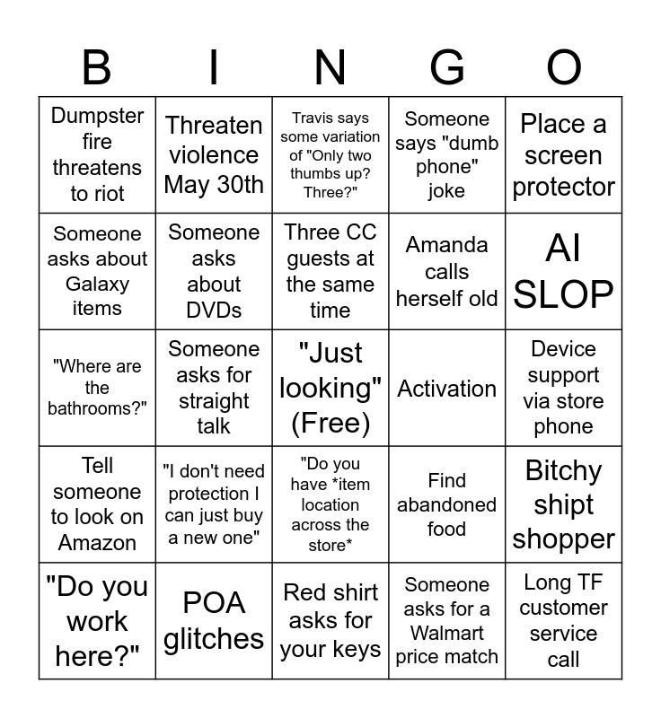 This bingo card has a free space and 49 words: Broken Iris Easy Flip, Long TF customer service call, Big rush before lunch, Red shirt asks for your keys, "I don't need protection I can just buy a new one", Android with malware, Threaten violence May 30th, People play on the switch display but don't buy anything, Someone asks about Galaxy items, Screaming child, Someone asks about DVDs, Someone says "dumb phone" joke, Bitchy shipt shopper, Find abandoned food, Guest asks something extremely specific, Guest asks for old gen phone case, Three CC guests at the same time, Activation, Daniel gloats in teams, Place a screen protector, Someone asks for straight talk, Someone asks for a Walmart price match, Dumpster fire threatens to riot, Amanda calls herself old, B says "livin la vida loca", AI SLOP, "Do you work here?", "Do you guys sell airpods?", "Do you have *item location across the store*, Tell someone to look on Amazon, Register is out of [coin], "Do I have to buy this back here?", "If it doesn't work can I return it?", Guest ignores your help, POA glitches, MyDay glitches, Someone messes up count on teams, Movista glitches, Device support via store phone, Nobody answers Travis's question, Someone is senselessly optimistic in teams, One of us complains about the Disney display, "Can you check the back?", "Do you have Pixel cases?", "Where are the bathrooms?", Travis says some variation of "Only two thumbs up? Three?", Open package but nothing is stolen, You have to unlock something in a different department and Isaac tries to roast Android.