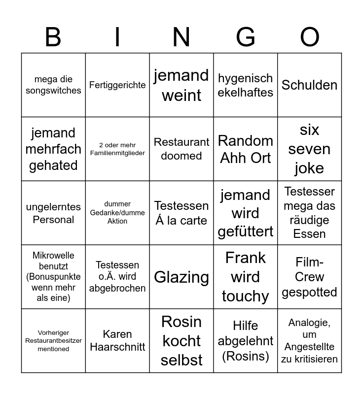 This bingo card has 25 words: Testessen o.Ä. wird abgebrochen, Rosin kocht selbst, Restaurant doomed, Vorheriger Restaurantbesitzer mentioned, Schulden, mega die songswitches, jemand mehrfach gehated, Fertiggerichte, jemand wird gefüttert, Glazing, Random Ahh Ort, ungelerntes Personal, Frank wird touchy, Film-Crew gespotted, 2 oder mehr Familienmitglieder, Analogie, um Angestellte zu kritisieren, Testesser mega das räudige Essen, jemand weint, six seven joke, dummer Gedanke/dumme Aktion, Testessen Á la carte, Karen Haarschnitt, Mikrowelle benutzt (Bonuspunkte wenn mehr als eine), hygenisch ekelhaftes and Hilfe abgelehnt (Rosins).