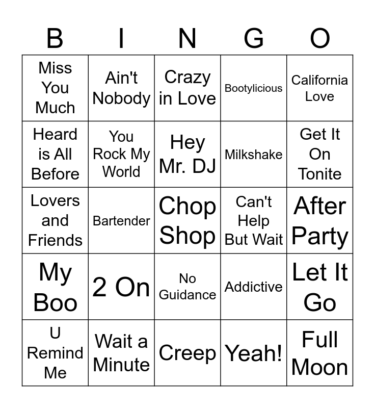 This bingo card has a free space and 32 words: Yeah!, Return of the Mack, Bartender, No Diggity, My Boo, You Rock My World, California Love, Let It Go, Ain't Nobody, Goodies, Hey Mr. DJ, Crazy in Love, You, Work Out, Can't Help But Wait, Slow Down, U Remind Me, Lovers and Friends, No Guidance, 2 On, Addictive, Just Friends, After Party, Wait a Minute, Full Moon, Bootylicious, Milkshake, Heard is All Before, Miss You Much, Creep, Touch Me Tease Me and Get It On Tonite.